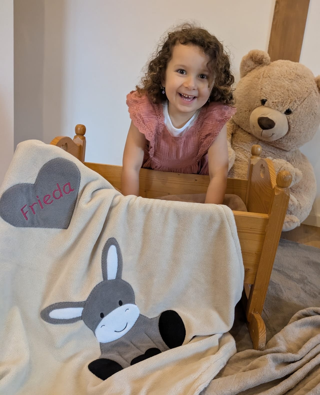 - Mit Liebe bestickt: Ob der Name des Kindes oder meine treuen Begleiter wie Giraffe, Bär und Pinguin – jedes Teil ist ein Unikat.